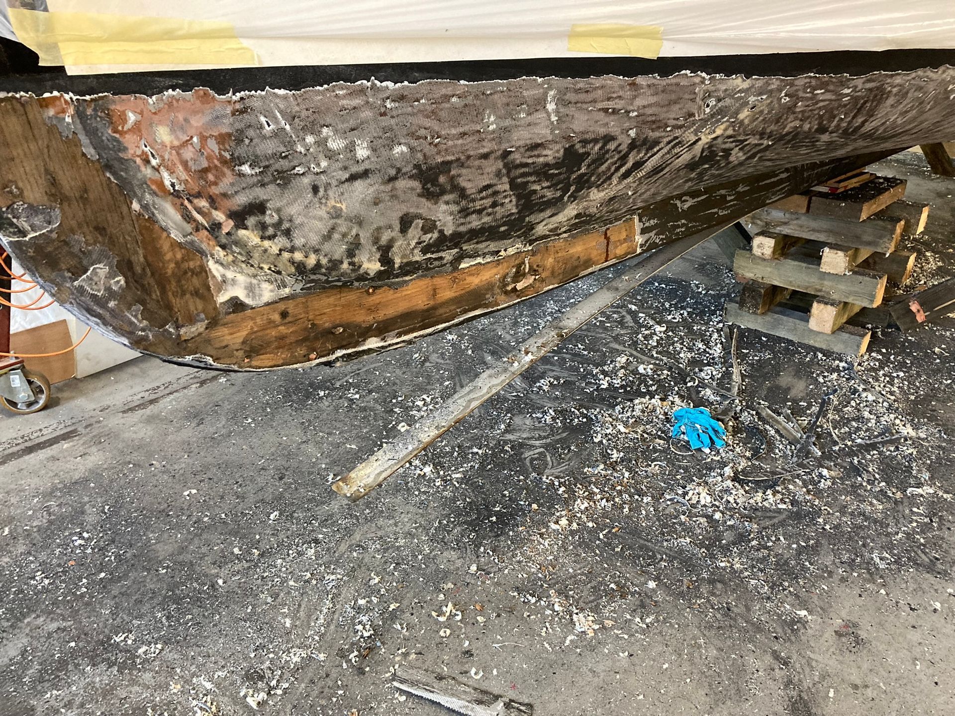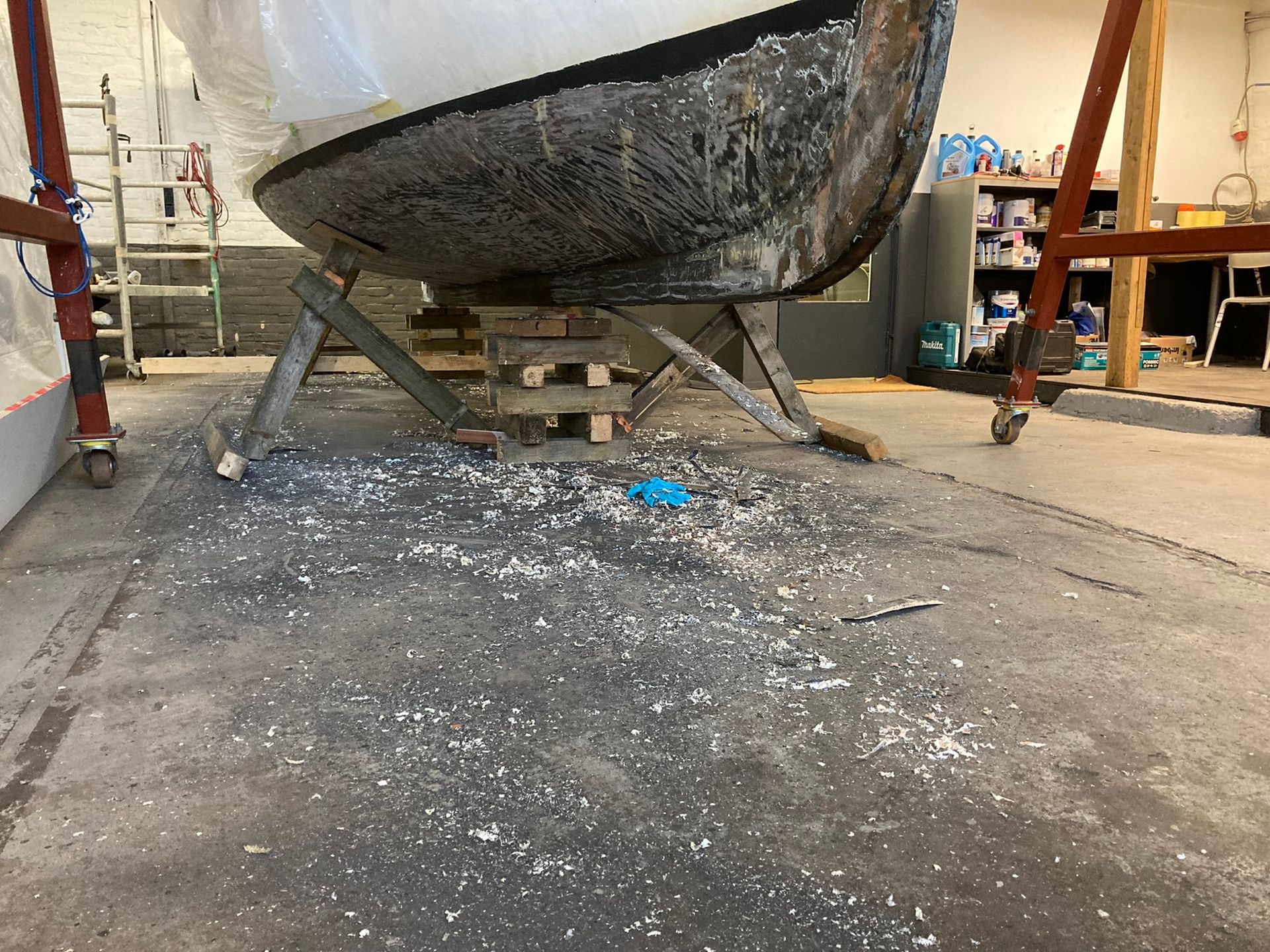 De romp is tot het glasweefsel kaal gehaald en alle beschadigingen zijn hersteld.