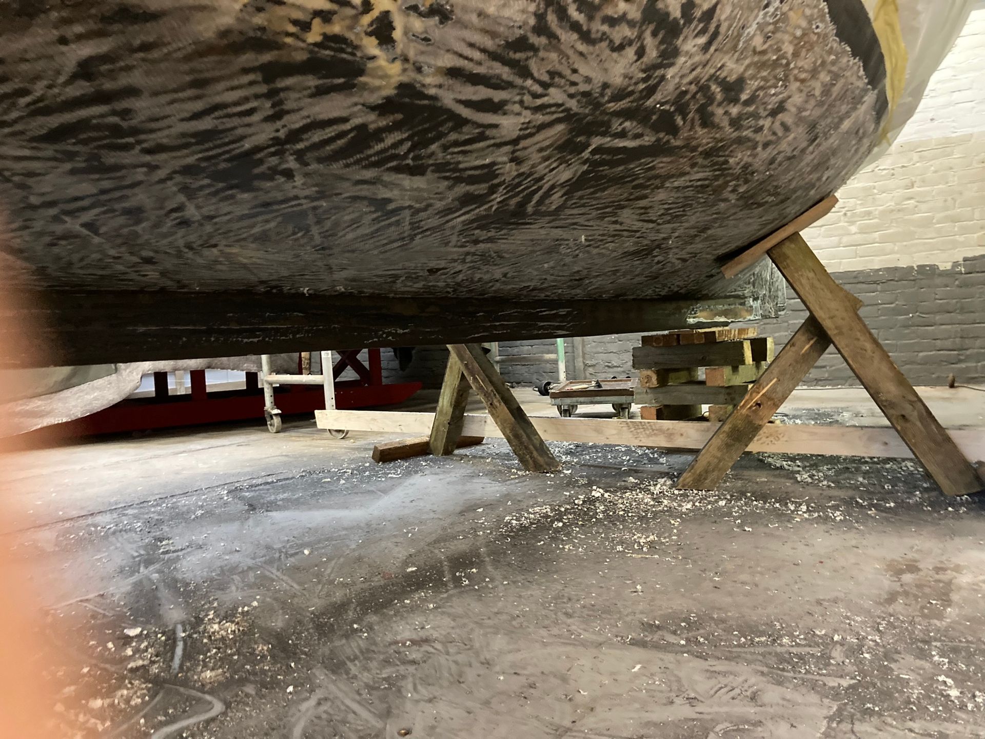 Het is een houten geklonken romp die ooit in de glasweefsel is gezet.