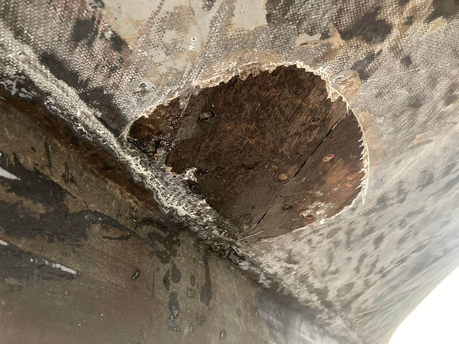 Door de jaren heen is het glasweefsel beschadigd en los gekomen van de romp.